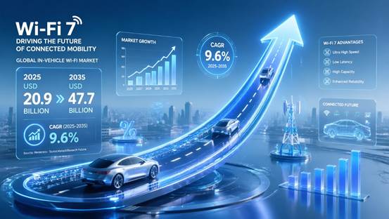 As smart cockpits become increasingly feature-rich, automobiles have evolved from simple means of transportation into a "second living space" integrating entertainment, work, and communication. This trend has directly driven the rapid growth of the in-vehicle Wi-Fi market. According to data from Global Market Insights (GMI), the global in-vehicle Wi-Fi market is projected to grow from $20.9 billion in 2025 to $47.7 billion in 2035, representing a compound annual growth rate (CAGR) of 9.6% .